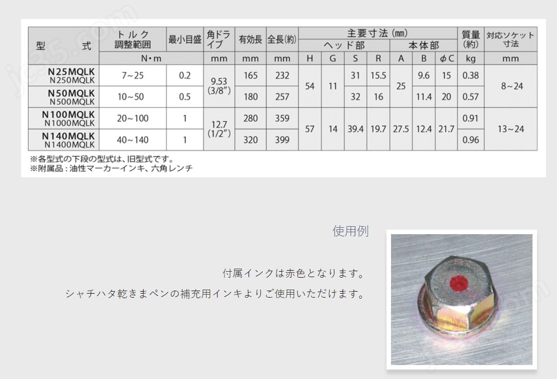 中村kanon套筒標記式扭力扳手N140MQLK,扭力可調整范圍40-140N.m,緊固作業同時可做出標記。墨水盒式,補充墨水十分容易。當扭力到達響聲后會自動噴漆經由套筒到螺帽上。